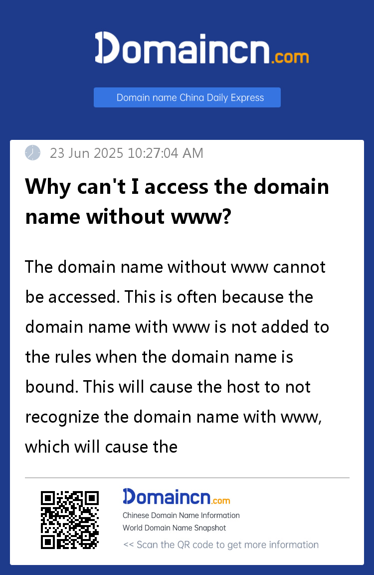 The domain name without www cannot be accessed. This is often because the domain name with www is not added to the rules when the domain name is bound. This will cause the host to not recognize the domain name with www, which will cause the domain name to be inaccessible.