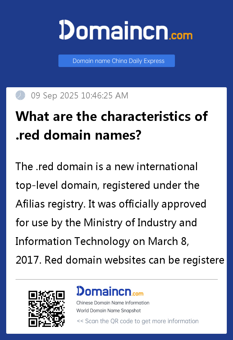 The .red domain is a new international top-level domain, registered under the Afilias registry. It was officially approved for use by the Ministry of Industry and Information Technology on March 8, 2017. Red domain websites can be registered for international comparison projects and are officially used in China.