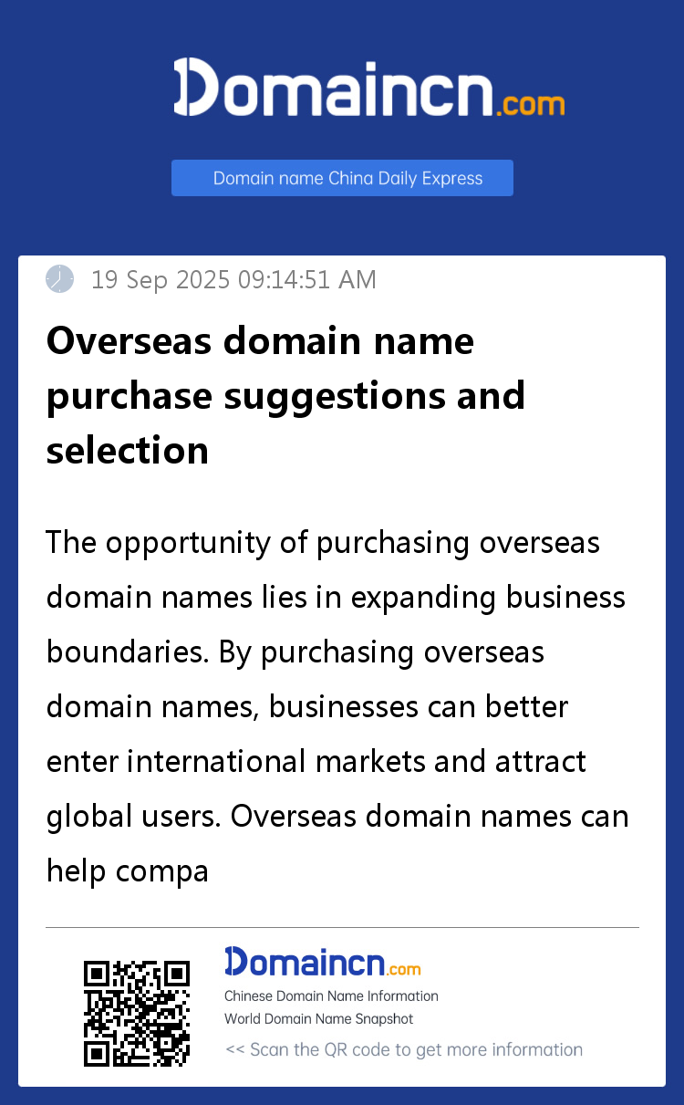 The opportunity of purchasing overseas domain names lies in expanding business boundaries. By purchasing overseas domain names, businesses can better enter international markets and attract global users. Overseas domain names can help companies establish an international image and enhance brand recognition. For individuals, owning a unique overseas domain name can enhance their personal image and expand their influence.