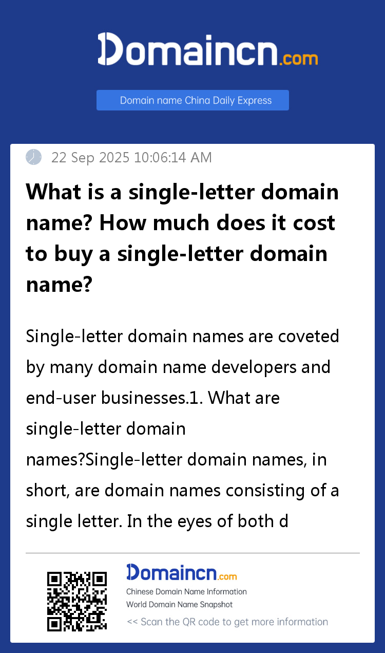 Single-letter domain names, in short, are domain names consisting of a single letter. In the eyes of both developers and end-user businesses, there are many criteria for evaluating a domain name, such as a good meaning and a .com suffix. However, shortness is also crucial. Shortness makes a domain name memorable and easy to type, creating a strong visual impact and a strong brand image for the end-user. Single-letter domain names perfectly meet the public's expectations for domain names. Their simplicity, memorability, and uniqueness make them highly sought after by domain name collectors and investors, making them a unique and valuable domain name.
