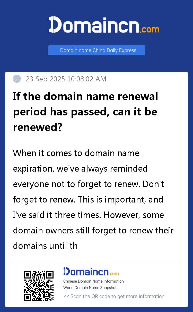 When it comes to domain name expiration, we've always reminded everyone not to forget to renew. Don't forget to renew. This is important, and I've said it three times. However, some domain owners still forget to renew their domains until they expire, are deleted, and are re-auctioned. For premium domains, this can be a significant loss for the owner.