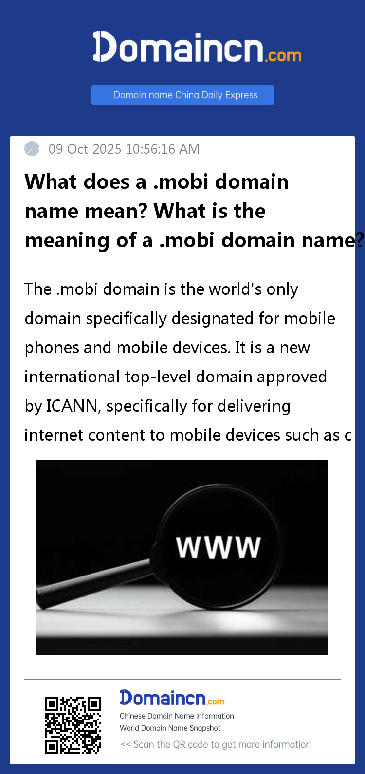 The .mobi mobile phone domain is unique and irreplaceable. Enterprises should quickly seize mobile internet address resources while also accumulating industry domain resources to lay a solid foundation for industry portals.