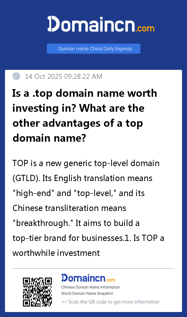 TOP is a new generic top-level domain (GTLD). Its English translation means "high-end" and "top-level," and its Chinese transliteration means "breakthrough." It aims to build a top-tier brand for businesses.