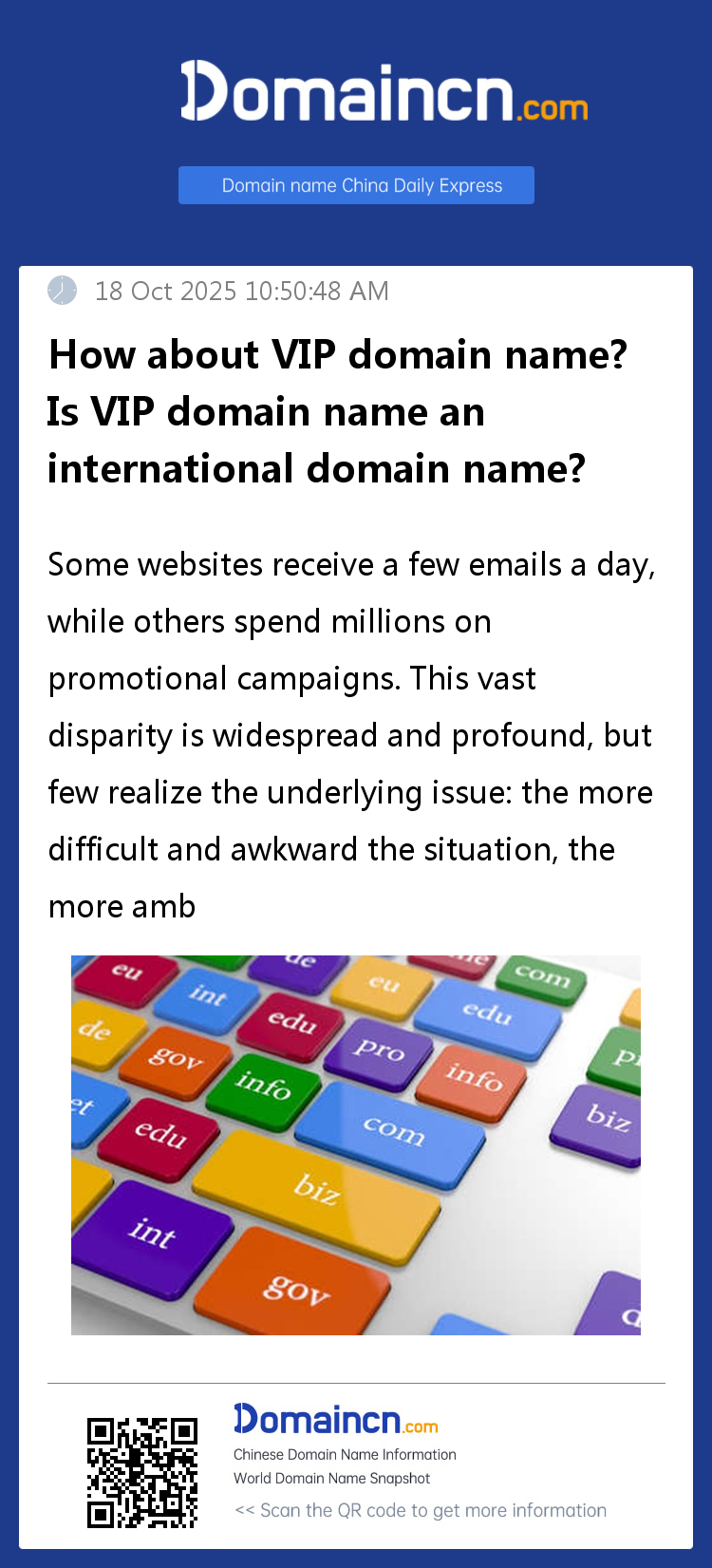 In terms of meaning, VIP stands for "high-end distinguished guests." This abbreviation is not only widely used by businesses and websites across various industries, but is also a universally recognized designation worldwide. Regarding appearance, the .vip suffix is only three characters long, which aligns with the Chinese preference for short suffixes. Its appeal, combined with its good appearance and high popularity, naturally led to its popularity.