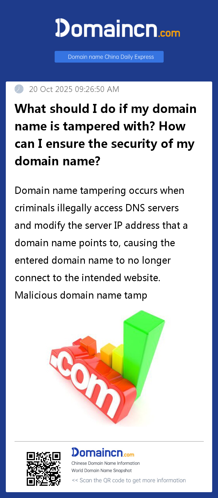 Domain name tampering occurs when criminals illegally access DNS servers and modify the server IP address that a domain name points to, causing the entered domain name to no longer connect to the intended website. Malicious domain name tampering can disrupt the normal operation of a website, causing losses for both the website owner and users, and is illegal.
