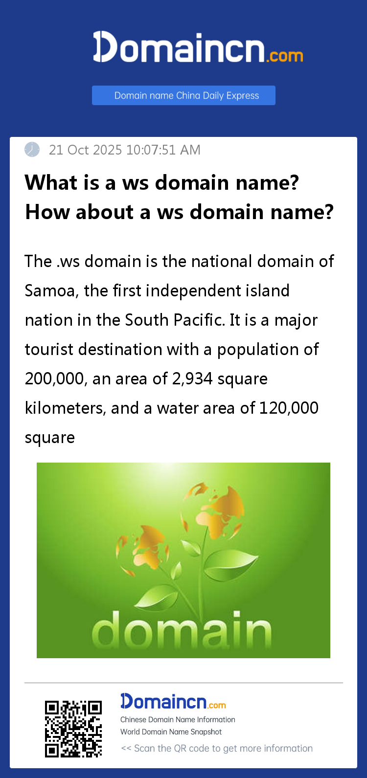 The .ws domain is the national domain of Samoa, the first independent island nation in the South Pacific. It is a major tourist destination with a population of 200,000, an area of 2,934 square kilometers, and a water area of 120,000 square kilometers. This suggests that if .ws domains were restricted to Samoa, they might not even be able to sustain their operating costs. Let's take a look at what .ws domains are and how they work.