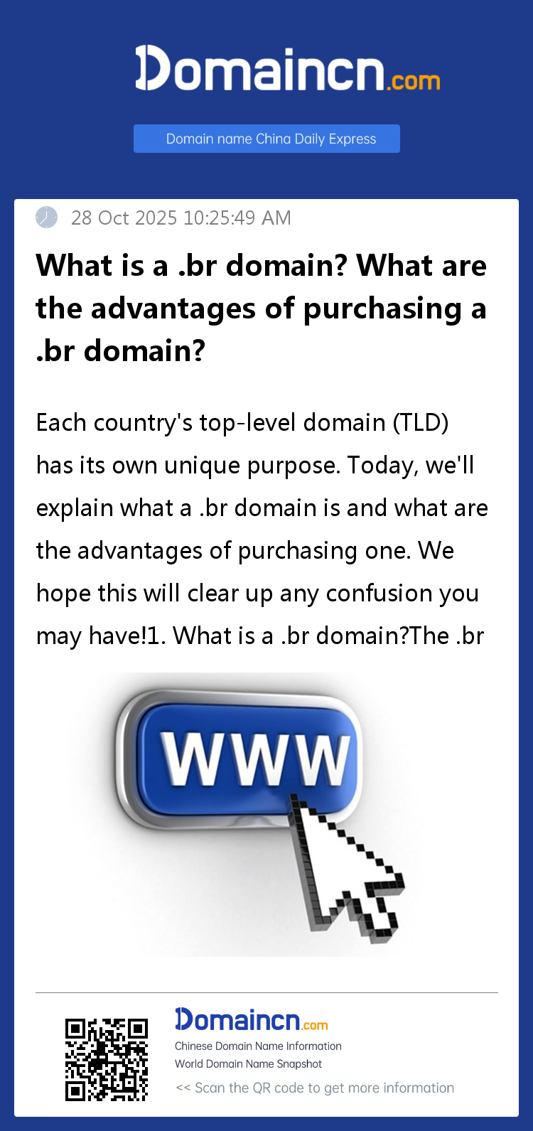 Compared to country domain names for countries with smaller populations and land areas, .br domain names have a wider scope of application and greater global recognition. However, due to the limitations of being a country domain, they are still not as widely used as top-level generic domains like .com and .net. With the increasing scarcity of .com domain names, high-quality country domain names have become a popular choice for many end users and domain name investors. The .br domain suffix, with its rich meaning and wide application, holds a promising future.