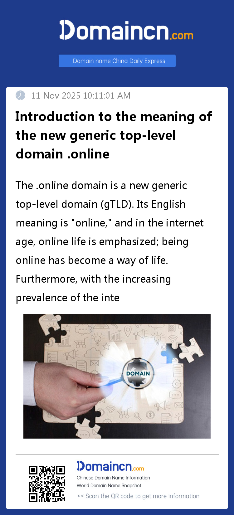 The .online domain is a new generic top-level domain (gTLD). Its English meaning is "online," and in the internet age, online life is emphasized; being online has become a way of life. Furthermore, with the increasing prevalence of the internet, "online" has become synonymous with many websites. For example, industry names and website content often include "online," such as "China Education Online" or "Beauty Online."
