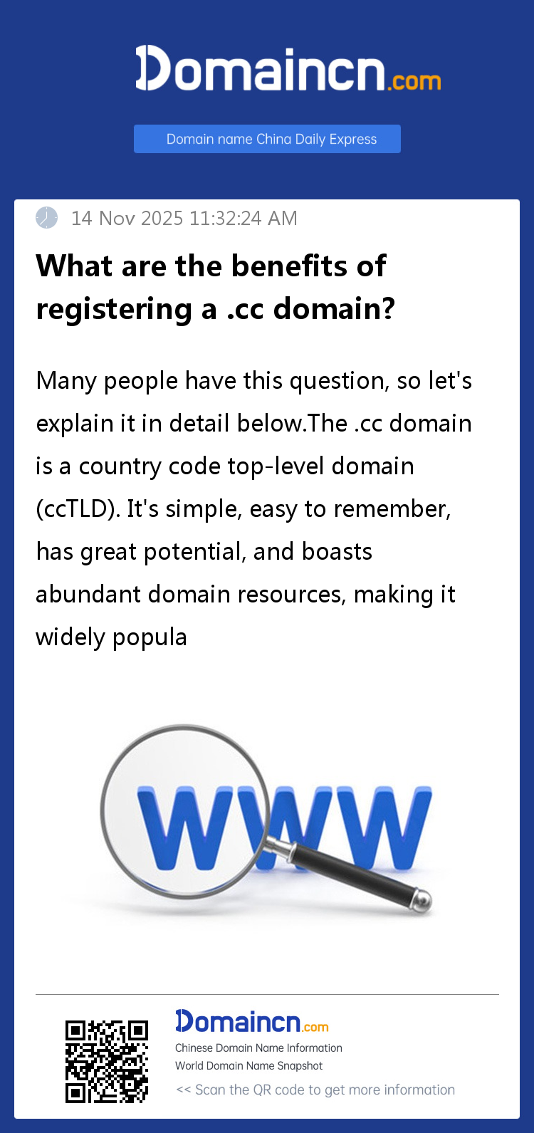The .cc domain is a country code top-level domain (ccTLD). It's simple, easy to remember, has great potential, and boasts abundant domain resources, making it widely popular among internet users.
