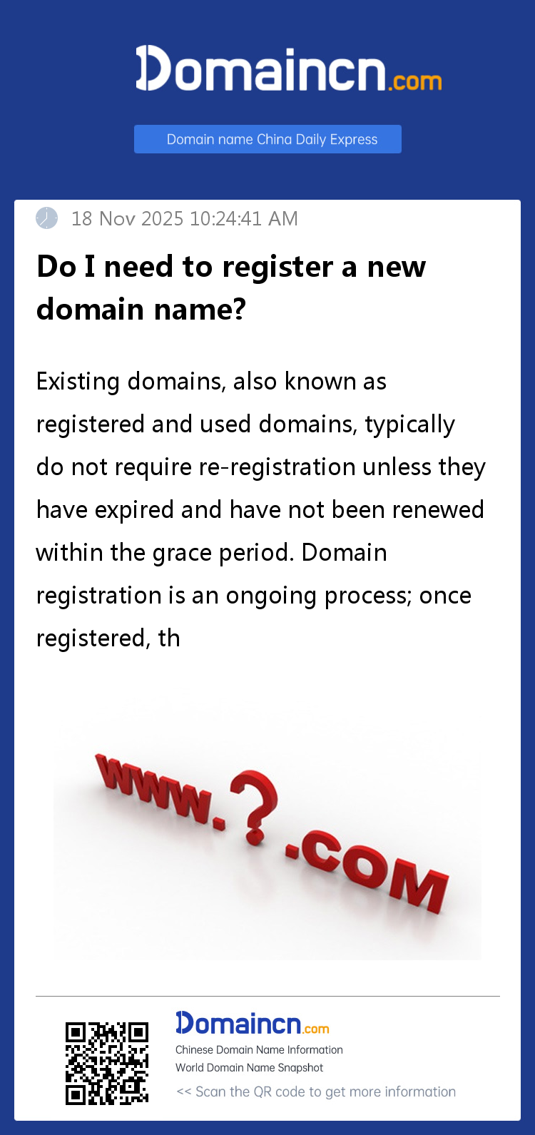 Older domains usually do not require re-registration; they can continue to be used as long as the renewal fee is paid as required. However, if a domain expires and is not renewed within the grace period, it may be deleted, in which case the original holder will need to re-register it. The renewal, expiration, and re-registration process involves multiple stages, and domain holders need to understand these stages and take appropriate measures to protect their domain assets.