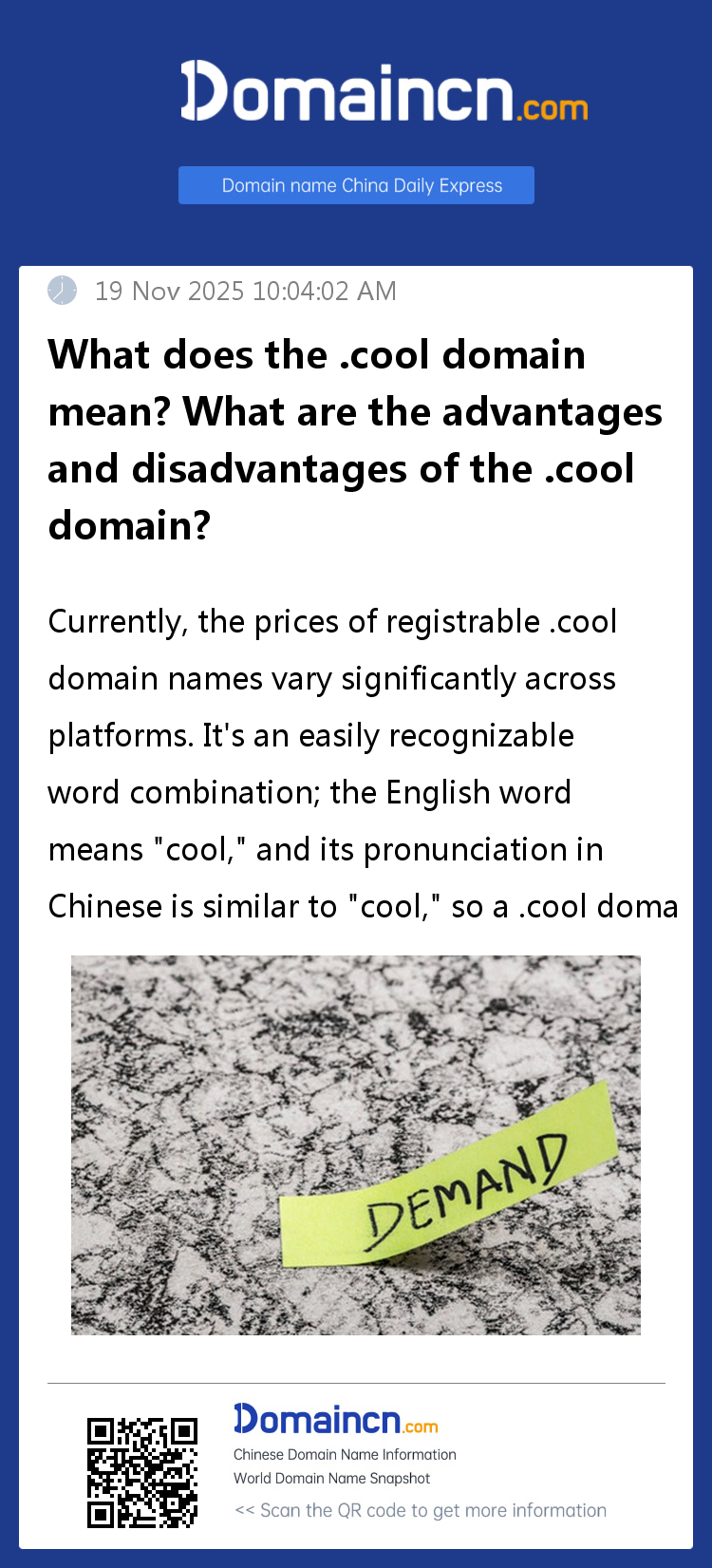 Currently, the prices of registrable .cool domain names vary significantly across platforms. It's an easily recognizable word combination; the English word means "cool," and its pronunciation in Chinese is similar to "cool," so a .cool domain also conveys the meaning of stylish and cool.