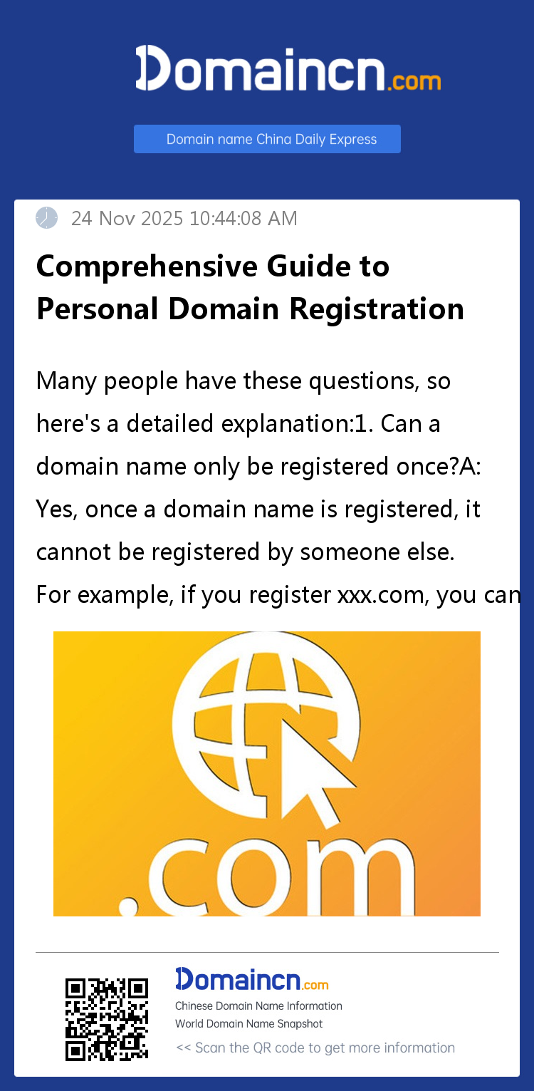 A: Yes, once a domain name is registered, it cannot be registered by someone else. For example, if you register xxx.com, you cannot register it again. However, you can check if other suffixes can be registered, such as xxx.top.