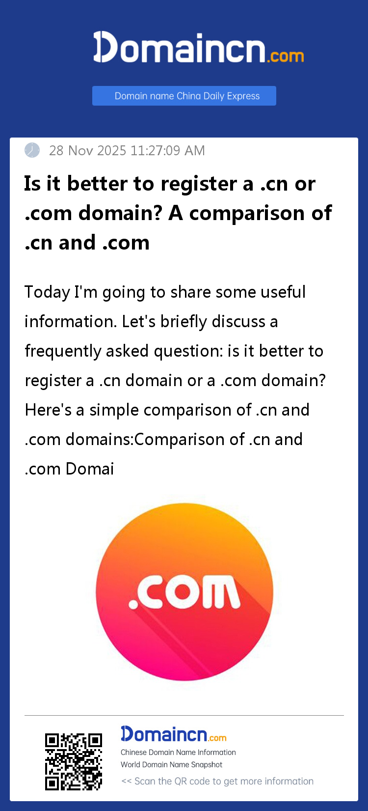 Today I'm going to share some useful information. Let's briefly discuss a frequently asked question: is it better to register a .cn domain or a .com domain? Here's a simple comparison of .cn and .com domains: