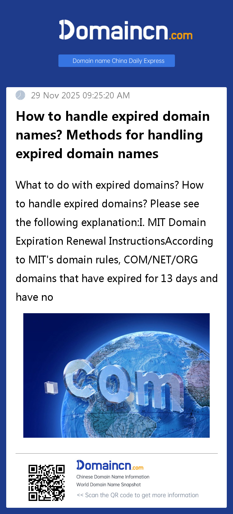 According to MIT's domain rules, COM/NET/ORG domains that have expired for 13 days and have not been renewed will be reclassified by MIT from our company's MIT agent account into the category of domains to be abandoned and prepared for deletion. This means that the domain owner has lost ownership and control of the domain, and therefore the domain may encounter several situations (but not limited to these):